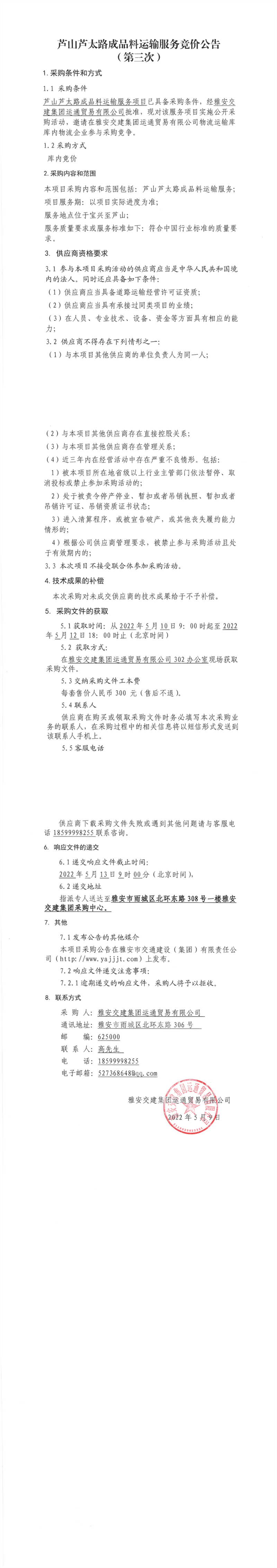 雅安交建集團(tuán)運(yùn)通貿(mào)易有限公司蘆山蘆太路成品料運(yùn)輸服務(wù)競價公告(第三次)