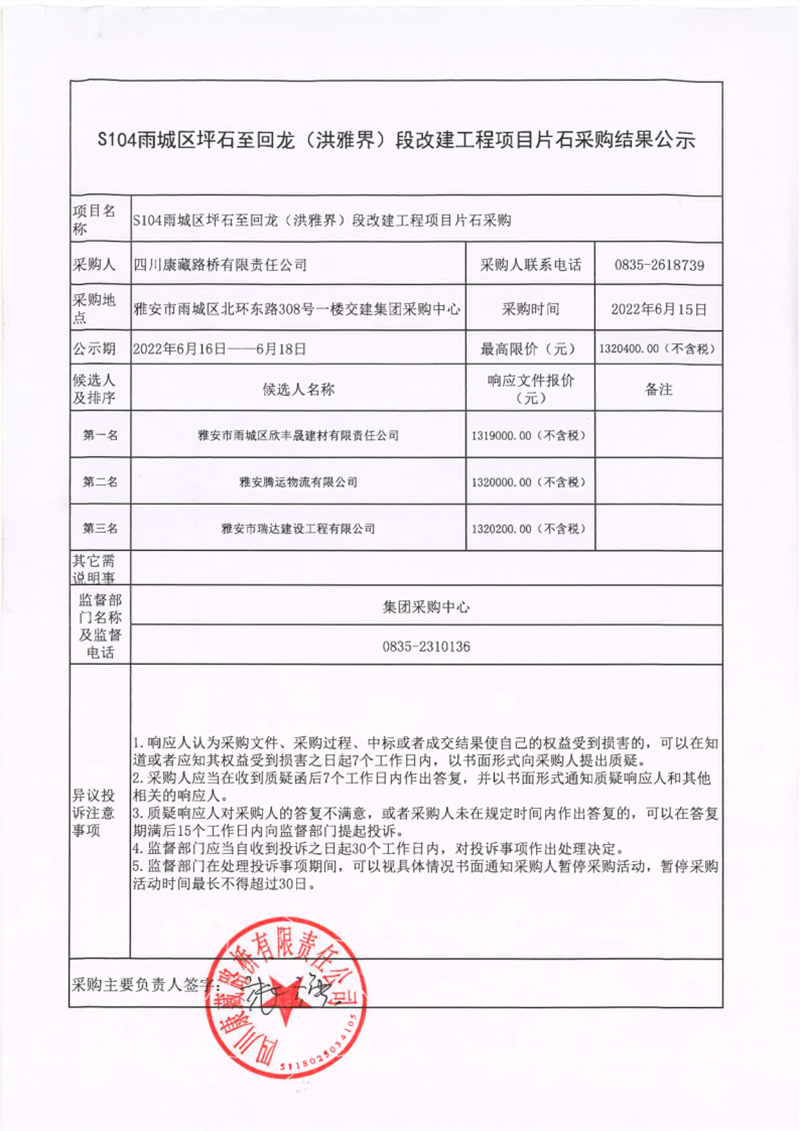 四川康藏路橋有限責(zé)任公司S104雨城區(qū)坪石至回龍(洪雅界)段改建工程項(xiàng)目片石采購結(jié)果公示