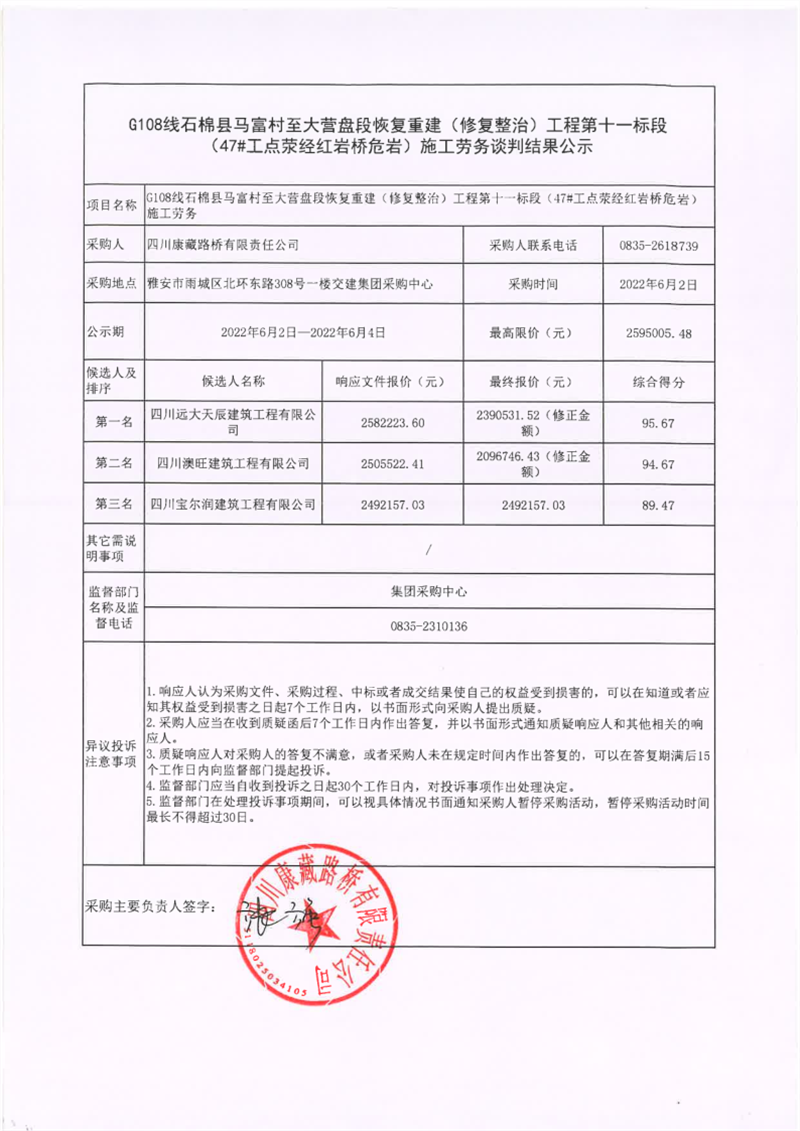 四川康藏路橋有限責任公司G108線石棉縣馬富村至大營盤段恢復重建(修復整治)工程第十一標段(47#工點滎經紅巖橋危巖)施工勞務談判結果公示
