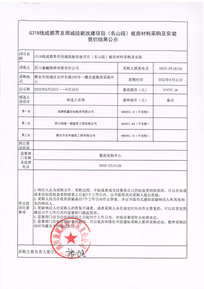 四川康藏路橋有限責(zé)任公司G318線成都界至雨城段新改建項(xiàng)目(名山段)板房材料采購及安裝競價結(jié)果公示