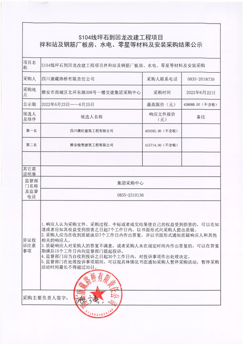 四川康藏路橋有限責(zé)任公司S104線坪石到回龍改建工程項目拌和站及鋼筋廠板房、水電、零星等材料及安裝采購結(jié)果公示