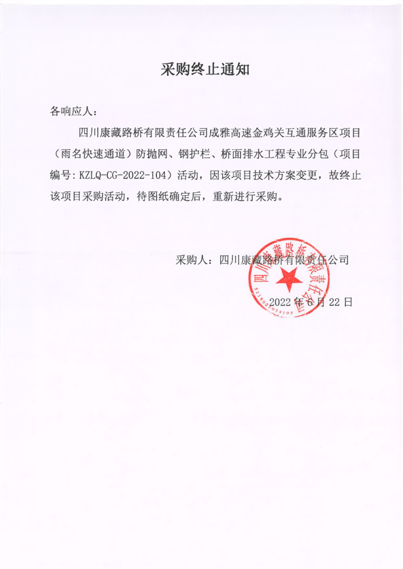 四川康藏路橋有限責(zé)任公司成雅高速金雞關(guān)互通服務(wù)區(qū)項(xiàng)目(雨名快速通道)防拋網(wǎng)、鋼護(hù)欄、橋面排水工程專(zhuān)業(yè)分包采購(gòu)終止通知