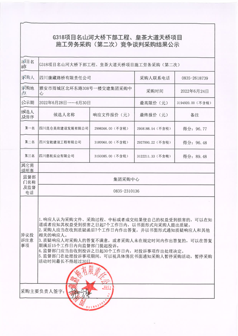 四川康藏路橋有限責(zé)任公司G318項(xiàng)目名山河大橋下部工程、皇茶大道天橋項(xiàng)目施工勞務(wù)采購(gòu)(第二次)競(jìng)爭(zhēng)談判采購(gòu)結(jié)果公示