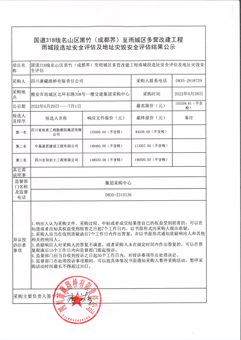 四川康藏路橋有限責(zé)任公司國(guó)道318名山區(qū)黑竹(成都界)至雨城區(qū)多營(yíng)段改建工程雨城段選址安全評(píng)估及地址災(zāi)毀安全評(píng)估結(jié)果公示