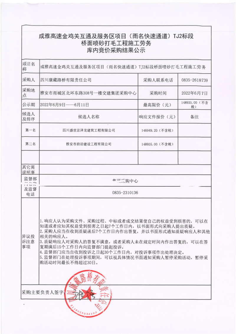 四川康藏路橋有限責(zé)任公司成雅高速金雞關(guān)互通服務(wù)區(qū)項目(雨名快速通道)TJ2標段橋面噴砂打毛工程施工勞務(wù)庫內(nèi)競價采購結(jié)果公示