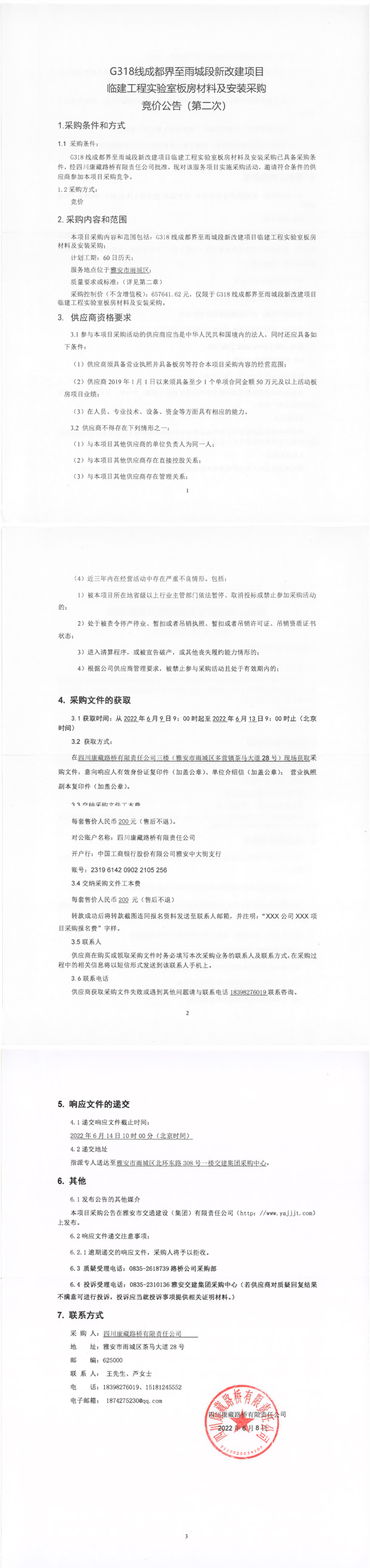 四川康藏路橋有限責(zé)任公司G318線成都界至雨城段新改建項(xiàng)目臨建工程實(shí)驗(yàn)室板房材料及安裝采購競價公告(第二次)