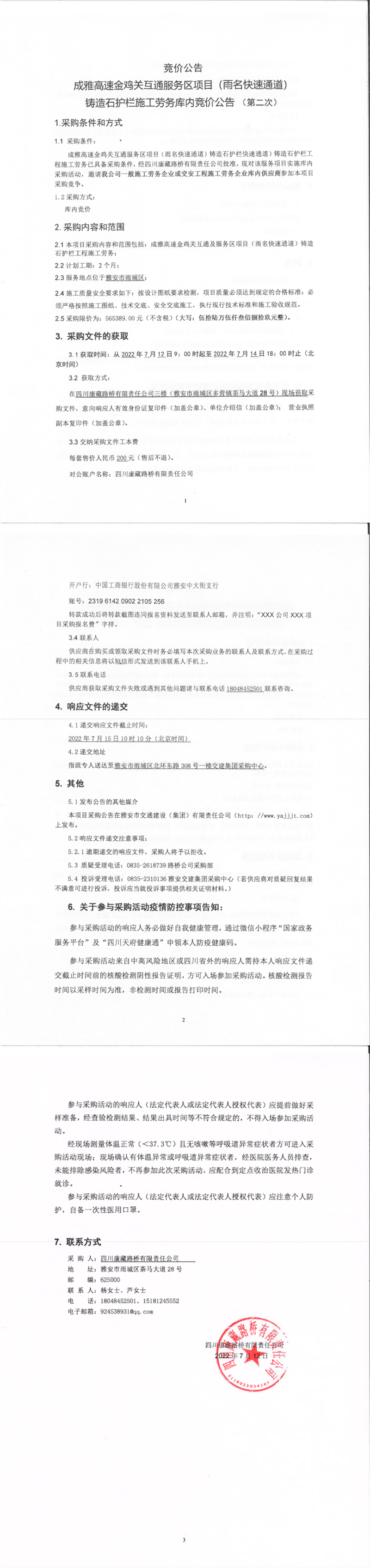 四川康藏路橋有限責(zé)任公司成雅高速金雞關(guān)互通服務(wù)區(qū)項目(雨名快速通道)鑄造石護欄施工勞務(wù)庫內(nèi)競價公告(第二次)