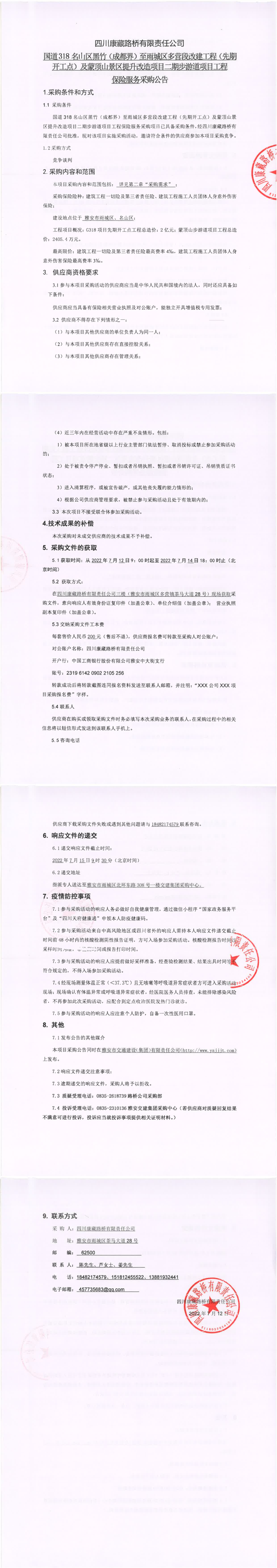 四川康藏路橋有限責(zé)任公司國道318名山區(qū)黑竹(成都界)至雨城區(qū)多營段改建工程(先期開工點(diǎn))及蒙頂山景區(qū)提升改造項(xiàng)目二期步游道項(xiàng)目工程保險(xiǎn)服務(wù)采購公告