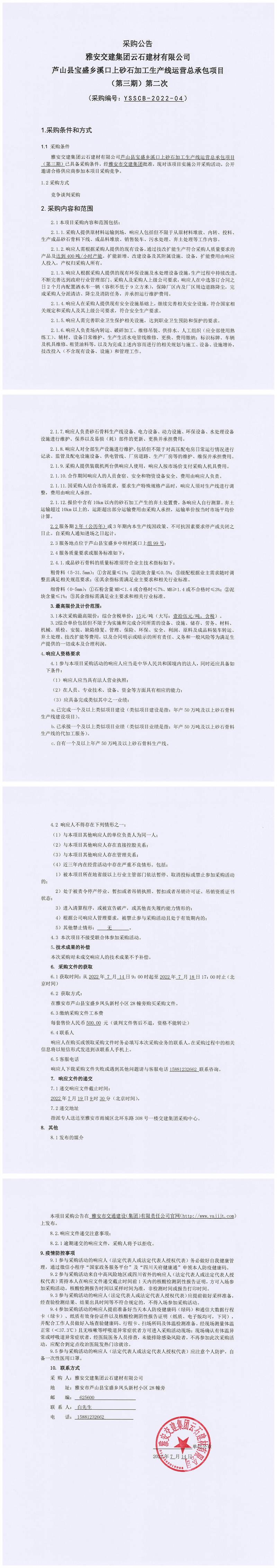 雅安交建集團云石建材有限公司蘆山縣寶盛鄉(xiāng)溪口上砂石加工生產線運營總承包項目(第三期)第二次采購公告