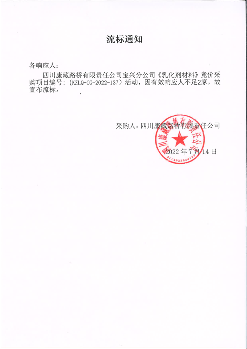 四川康藏路橋有限責(zé)任公司寶興分公司乳化劑材料采購(gòu)流標(biāo)通知