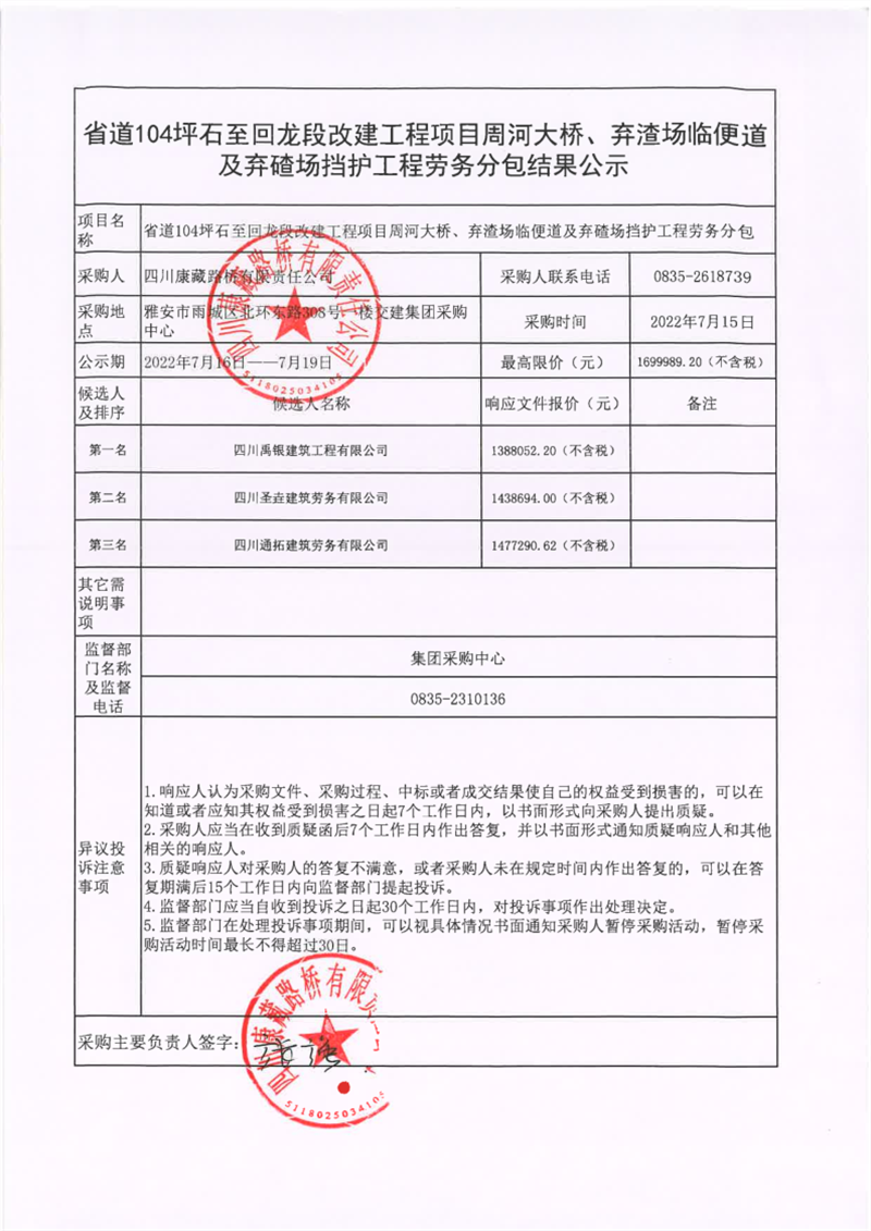 四川康藏路橋有限責(zé)任公司省道104坪石至回龍段改建工程項(xiàng)目周河大橋、棄渣場(chǎng)臨便道及棄碴場(chǎng)擋護(hù)工程勞務(wù)分包結(jié)果公示