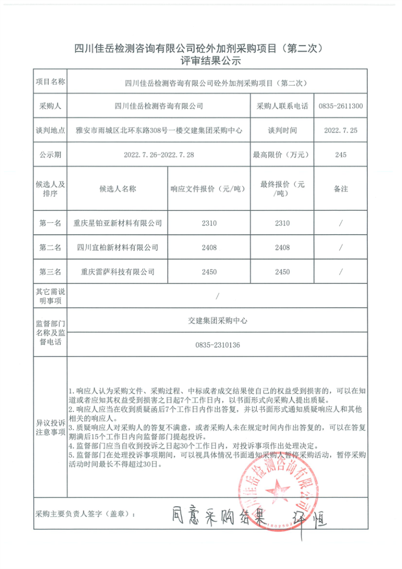 四川佳岳檢測(cè)咨詢有限公司砼外加劑采購項(xiàng)目(第二次)評(píng)審結(jié)果公示