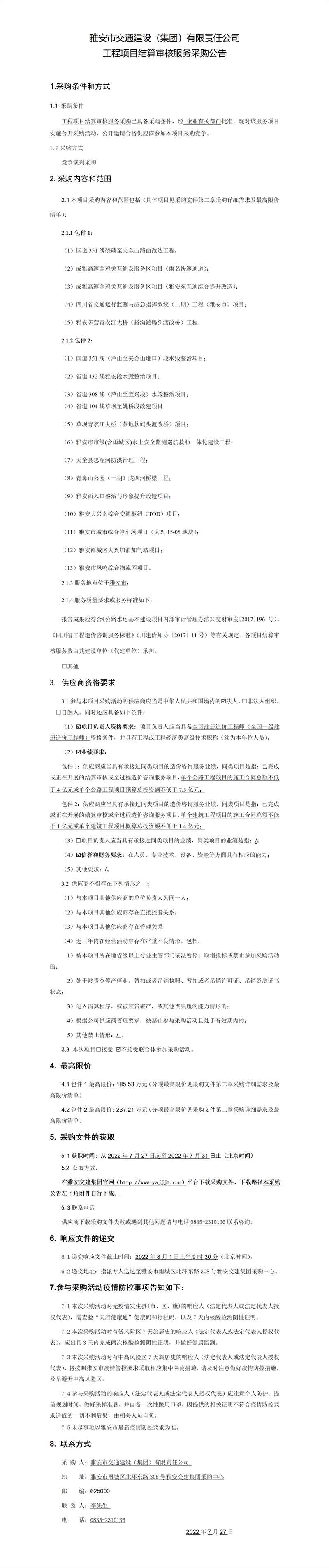 雅安市交通建設(集團)有限責任公司工程項目結算審核服務采購公告