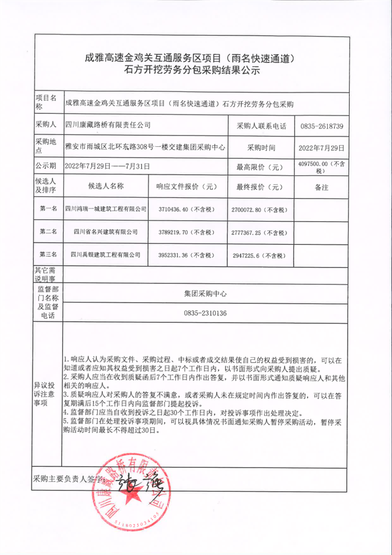四川康藏路橋有限責任公司成雅高速金雞關(guān)互通服務(wù)區(qū)項目(雨名快速通道)石方開挖勞務(wù)分包采購結(jié)果公示