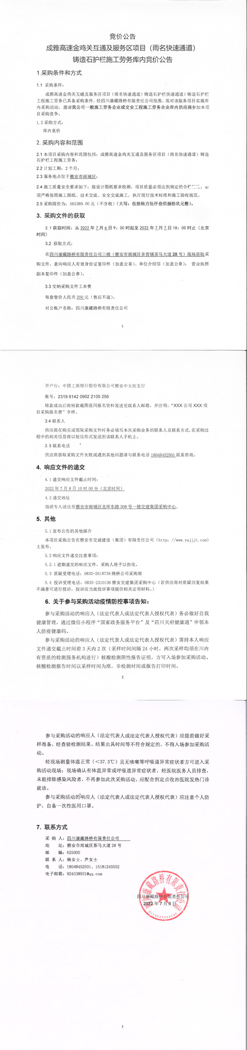 四川康藏路橋有限責任公司成雅高速金雞關(guān)互通及服務(wù)區(qū)項目(雨名快速通道)鑄造石護欄施工勞務(wù)庫內(nèi)競價公告