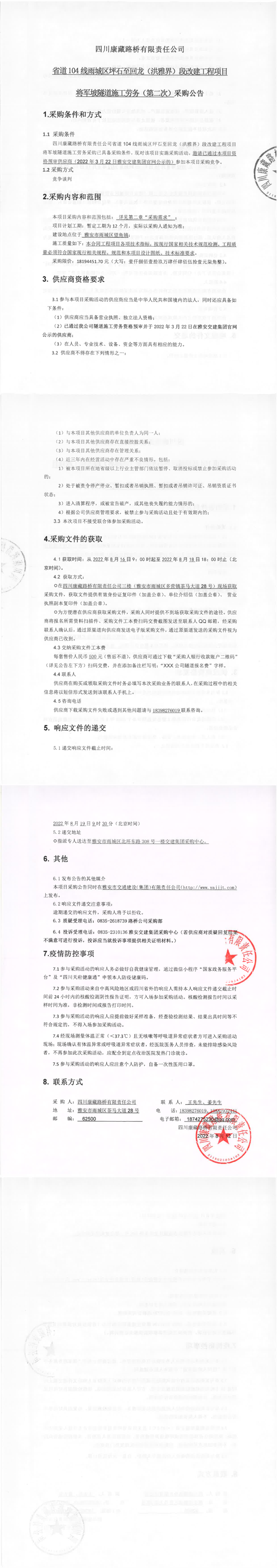 四川康藏路橋有限責任公司省道104線雨城區(qū)坪石至回龍(洪雅界)段改建工程項目
