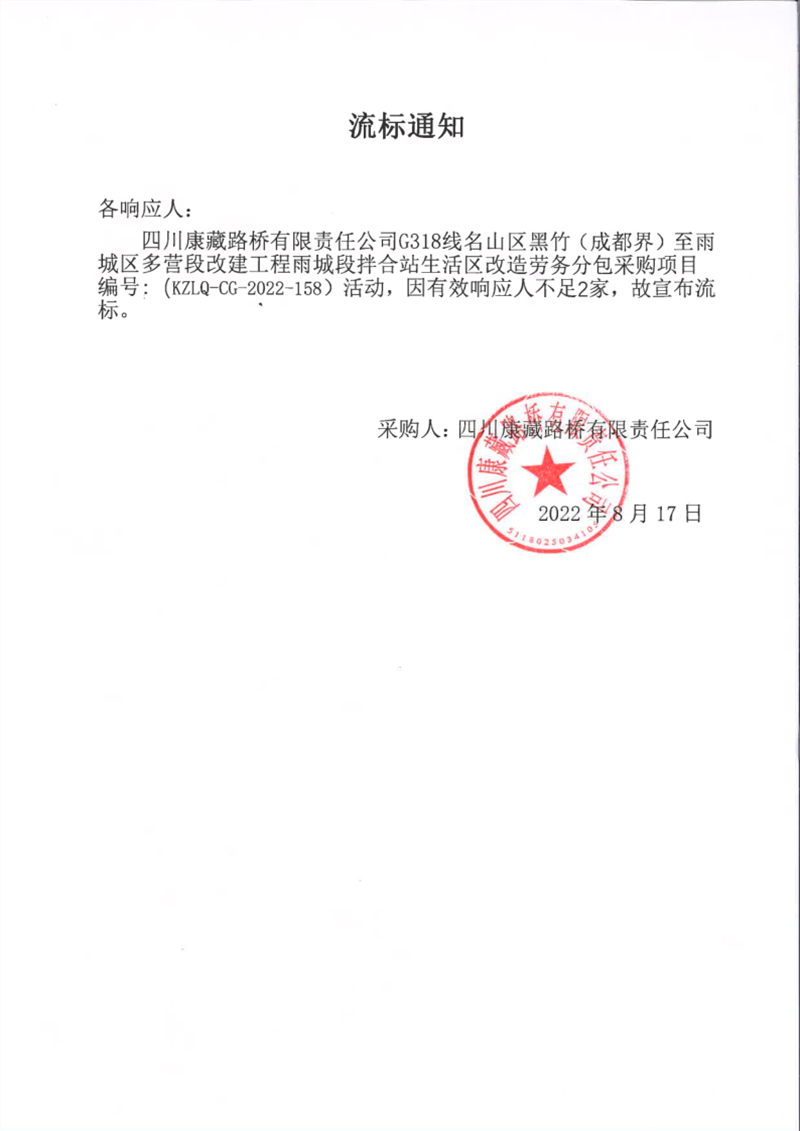 四川康藏路橋有限責(zé)任公司G318線名山區(qū)黑竹(成都界)至雨城區(qū)多營段改建工程雨城段拌合站生活區(qū)改造勞務(wù)分包采購項目流標(biāo)通知