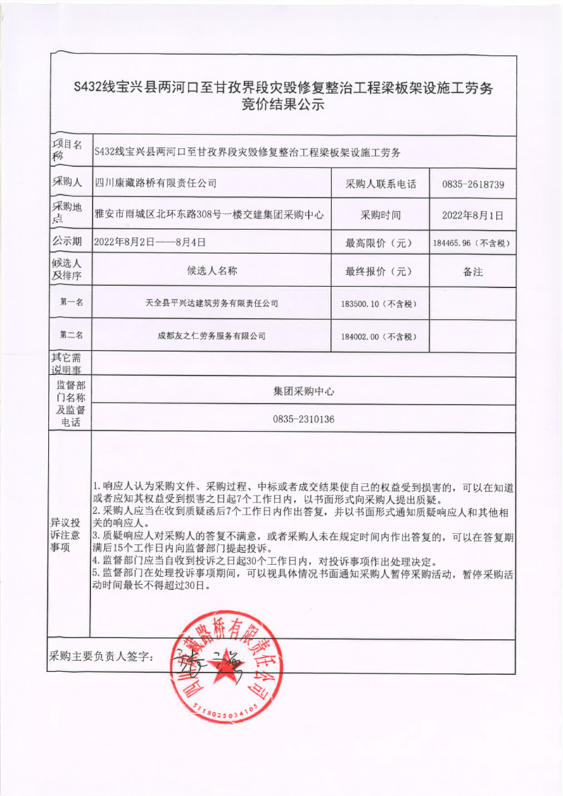 四川康藏路橋有限責任公司S432線寶興縣兩河口至甘孜界段災毀修復整治工程梁板架設施工勞務競價結果公示