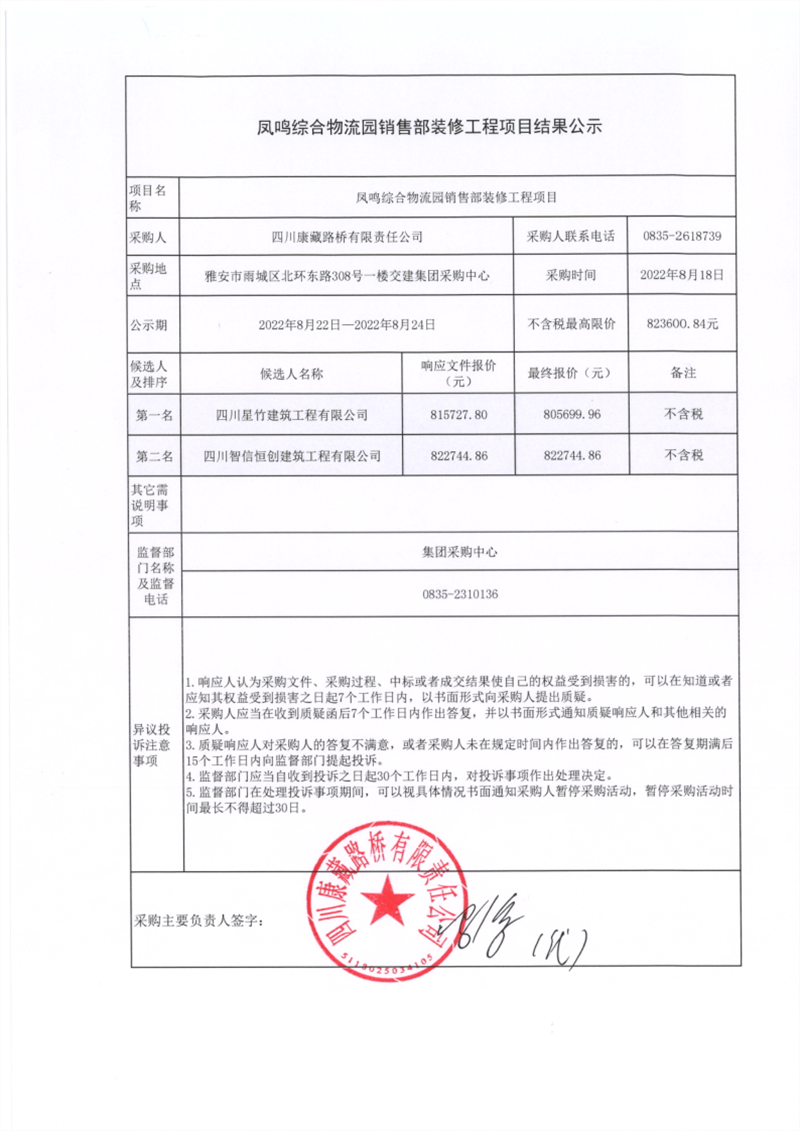 四川康藏路橋有限責(zé)任公司鳳鳴綜合物流園銷售部裝修工程項(xiàng)目結(jié)果公示