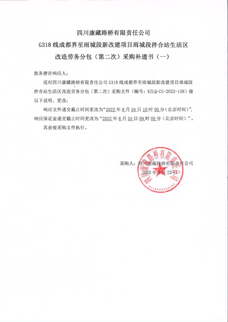 四川康藏路橋有限責任公司G318線成都界至雨城段新改建項目雨城段拌合站生活區(qū)改造勞務(wù)分包(第二次)采購補遺書(一)