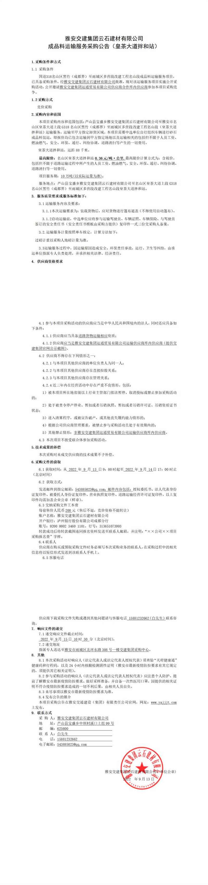 雅安交建集團(tuán)云石建材有限公司成品料運輸服務(wù)采購公告(皇茶大道拌和站)