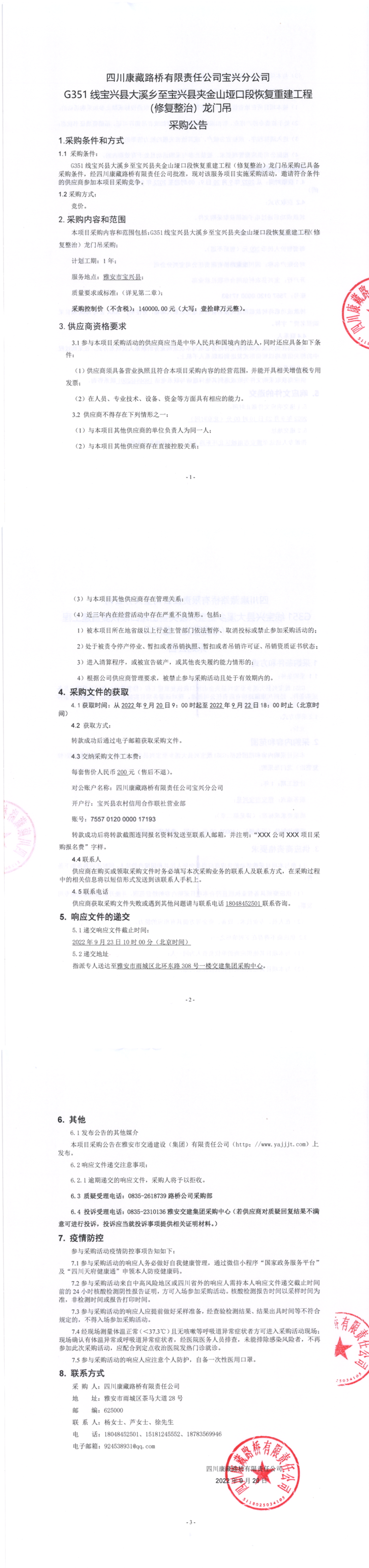 四川康藏路橋有限責(zé)任公司寶興分公司G351大溪鄉(xiāng)至寶興縣夾金山埡口段恢復(fù)重建工程(修復(fù)整治)龍門(mén)吊采購(gòu)公告