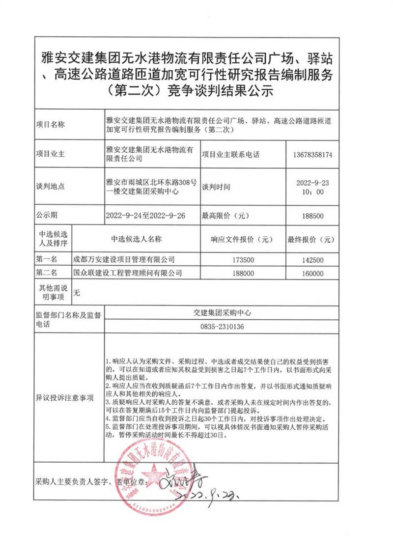 雅安交建集團(tuán)無水港物流有限責(zé)任公司廣場、驛站、高速公路道路匝道加寬可行性研究報告編制服務(wù)(第二次)競爭談判結(jié)果公示
