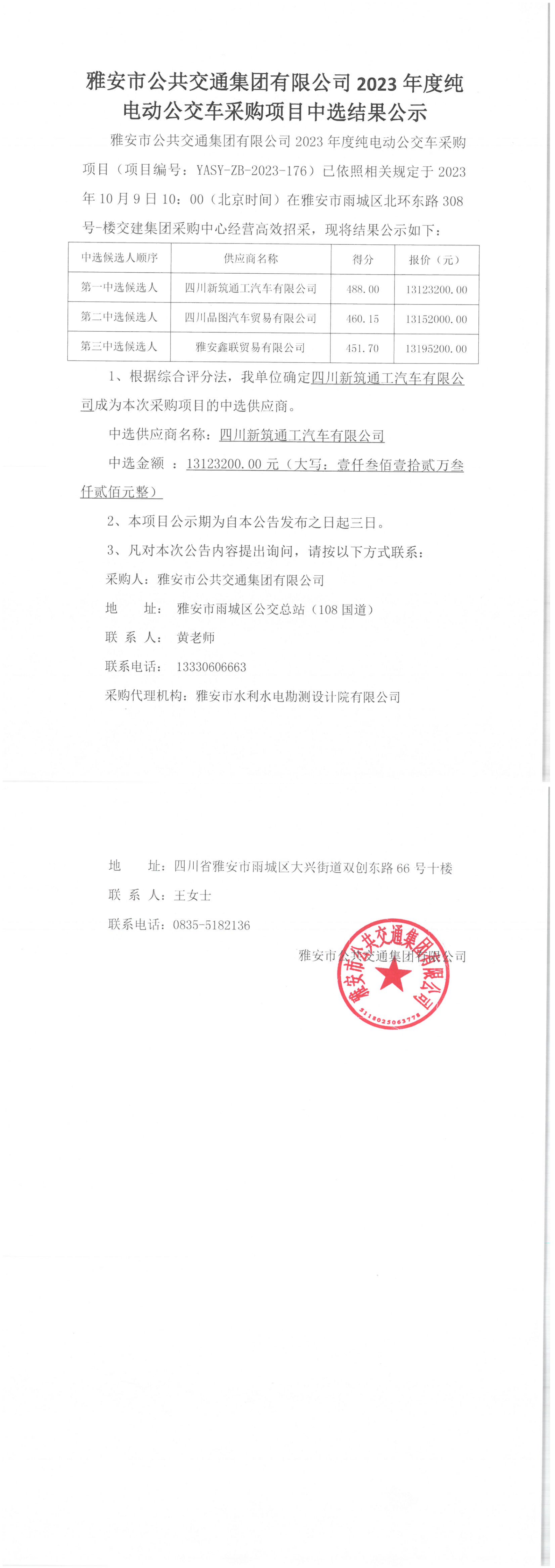 雅安市公共交通集團(tuán)有限公司2023年度純電動(dòng)公交車(chē)采購(gòu)項(xiàng)目中選結(jié)果公示