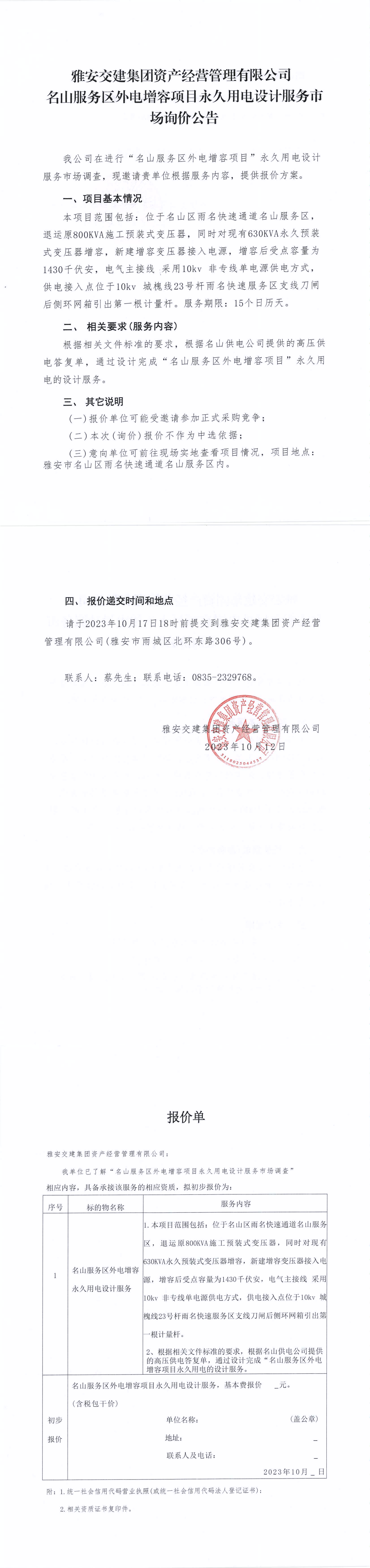 雅安交建集團(tuán)資產(chǎn)經(jīng)營(yíng)管理有限公司名山服務(wù)區(qū)外電增容項(xiàng)目永久用電設(shè)計(jì)服務(wù)市場(chǎng)詢(xún)價(jià)公告