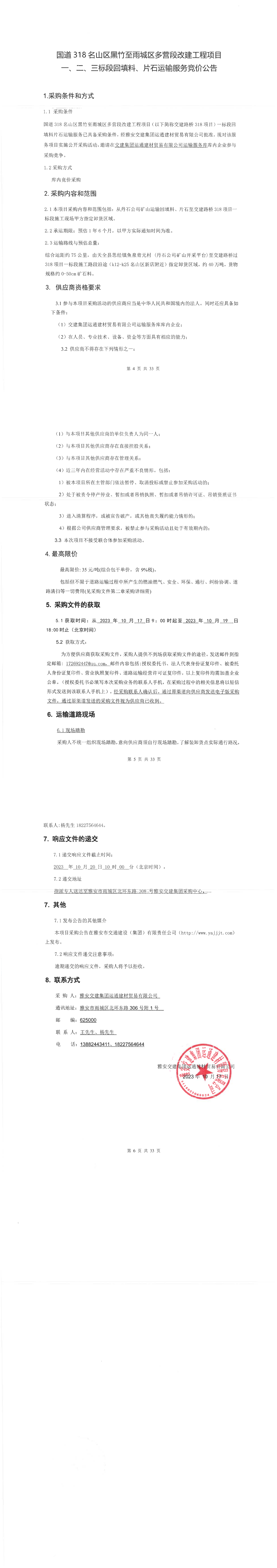 雅安交建集團(tuán)運(yùn)通建材貿(mào)易有限公司國道名山區(qū)黑竹至雨城區(qū)多營段改建工程項(xiàng)目一、二、三標(biāo)段回填料、片石運(yùn)輸服務(wù)競價公告