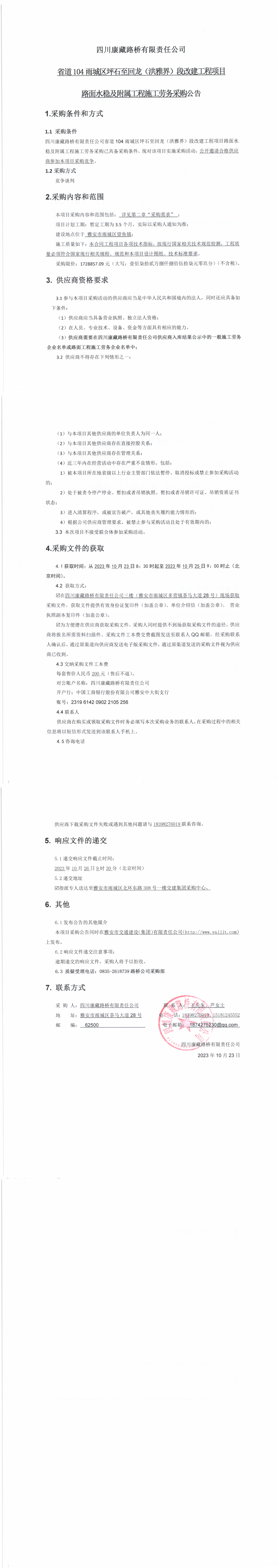 四川康藏路橋有限責任公司省道104雨城區(qū)坪石至回龍(洪雅界)段改建工程項目路面水穩(wěn)及附屬工程施工勞務采購公告