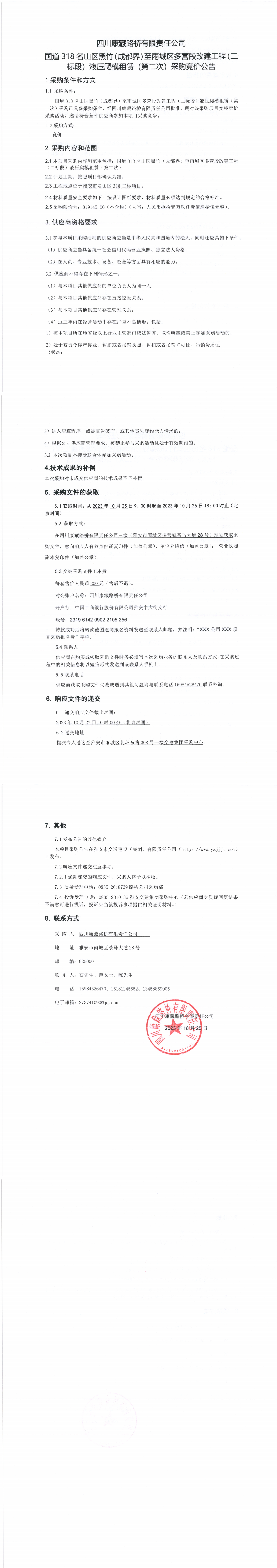 四川康藏路橋有限責(zé)任公司國(guó)道318名山區(qū)黑竹(成都界)至雨城區(qū)多營(yíng)段改建工程二標(biāo)段液壓爬模租賃(第二次)采購(gòu)競(jìng)價(jià)公告
