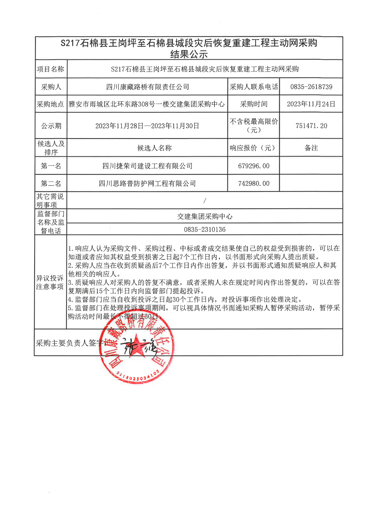 四川康藏路橋有限責任公司S217石棉縣王崗坪至石棉縣城段災后恢復重建工程主動網(wǎng)采購結(jié)果公示