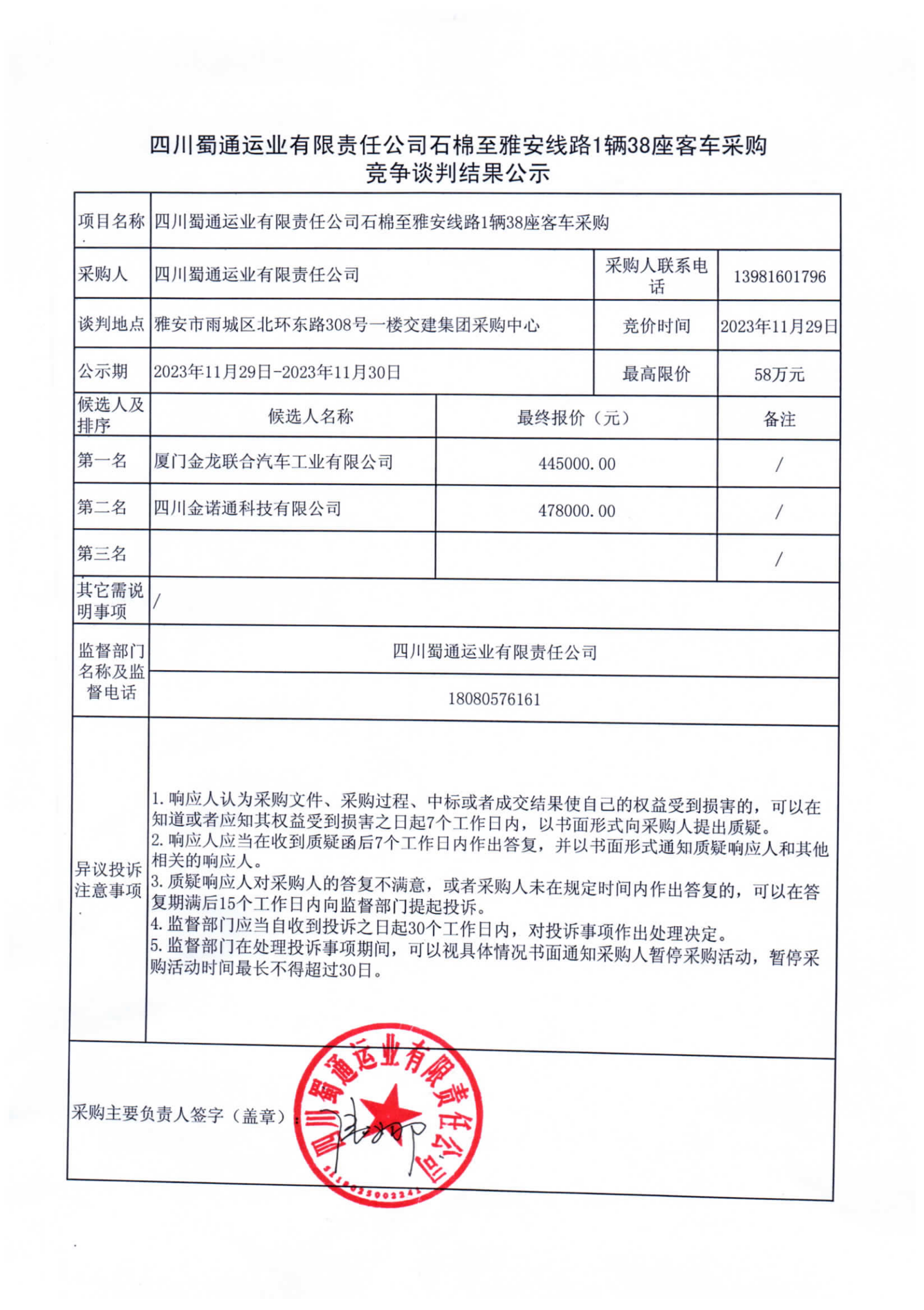 四川蜀通運(yùn)業(yè)有限責(zé)任公司石棉至雅安線路1輛38座客車采購(gòu)競(jìng)爭(zhēng)談判結(jié)果公示