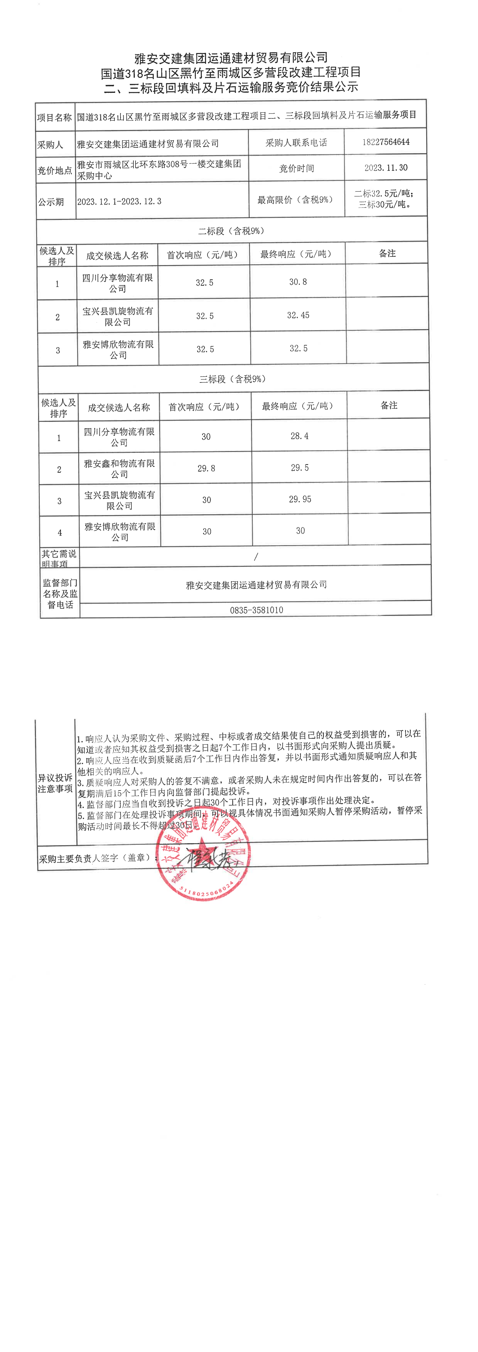 雅安交建集團(tuán)運(yùn)通建材貿(mào)易有限公司國道318名山區(qū)黑竹至雨城區(qū)多營段改建工程項目二、三標(biāo)段回填料、片石運(yùn)輸服務(wù)競價結(jié)果公示