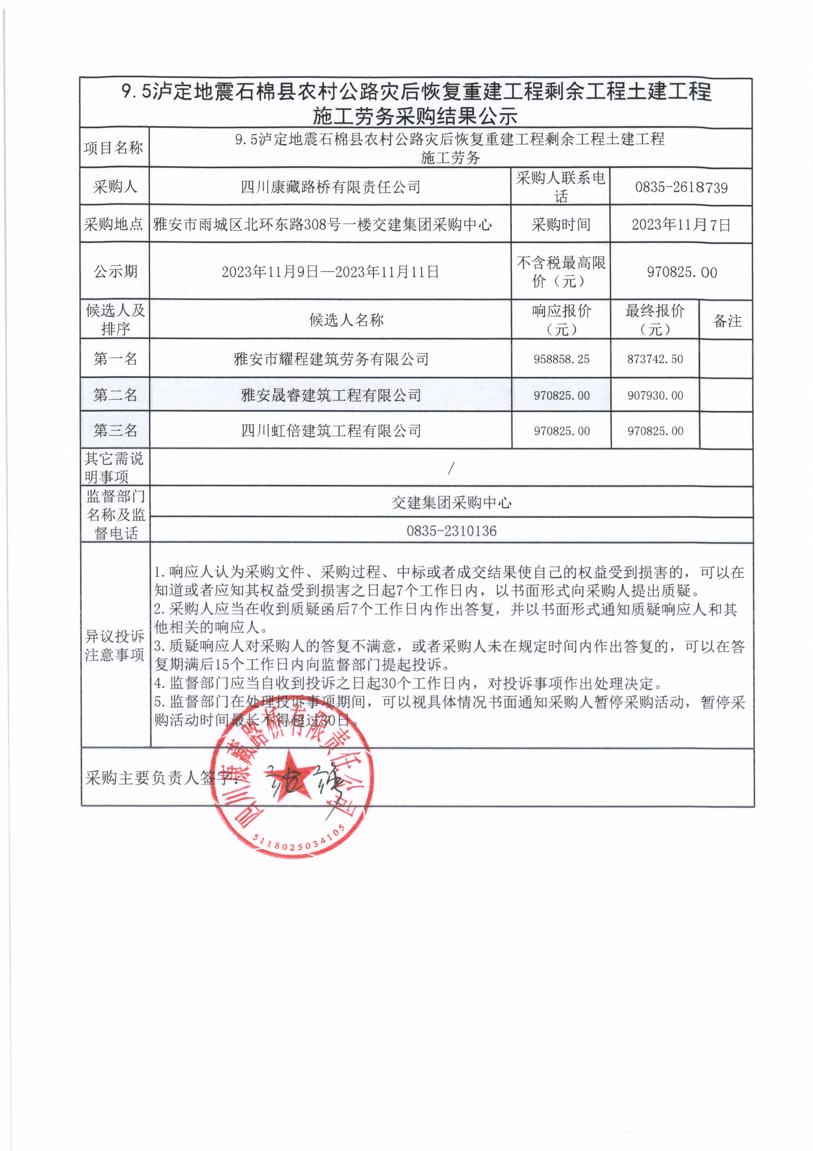 四川康藏路橋有限責任公司9.5瀘定地震石棉縣農村公路災后恢復重建工程剩余工程土建工程施工勞務采購結果公示