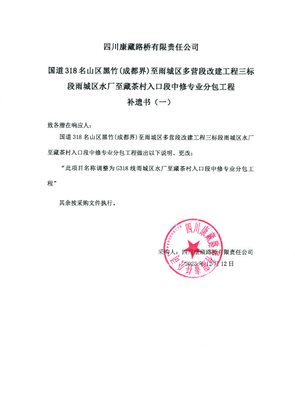 四川康藏路橋有限責任公司國道318名山區(qū)黑竹(成都界)至雨城區(qū)多營段改建工程三標段雨城區(qū)水廠至藏茶村入口段中修專業(yè)分包工程(補遺書一)