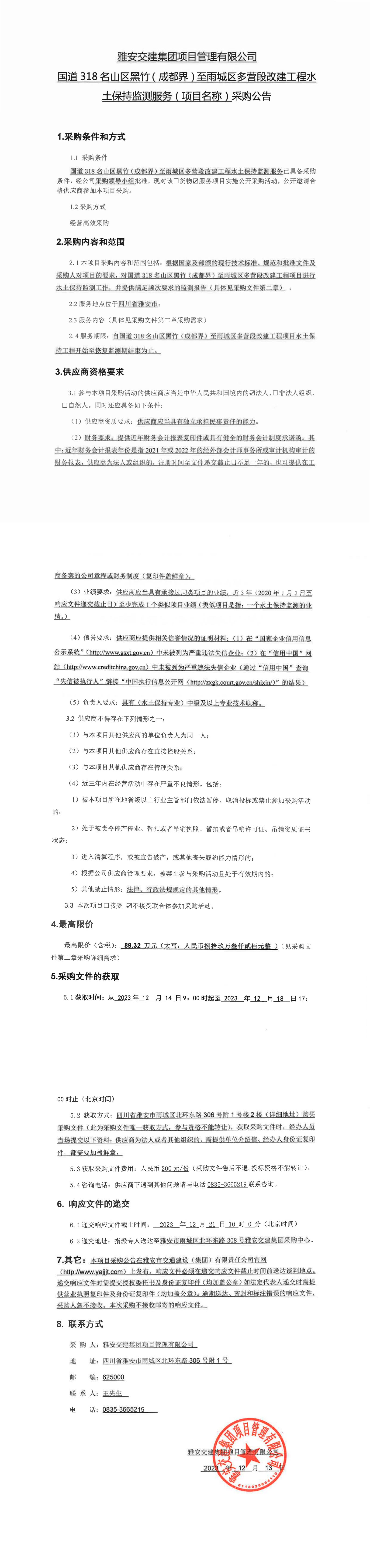 雅安交建集團(tuán)項(xiàng)目管理有限公司國(guó)道318名山區(qū)黑竹(成都界)至雨城區(qū)多營(yíng)段改建工程水土保持監(jiān)測(cè)服務(wù)(項(xiàng)目名稱)采購公告