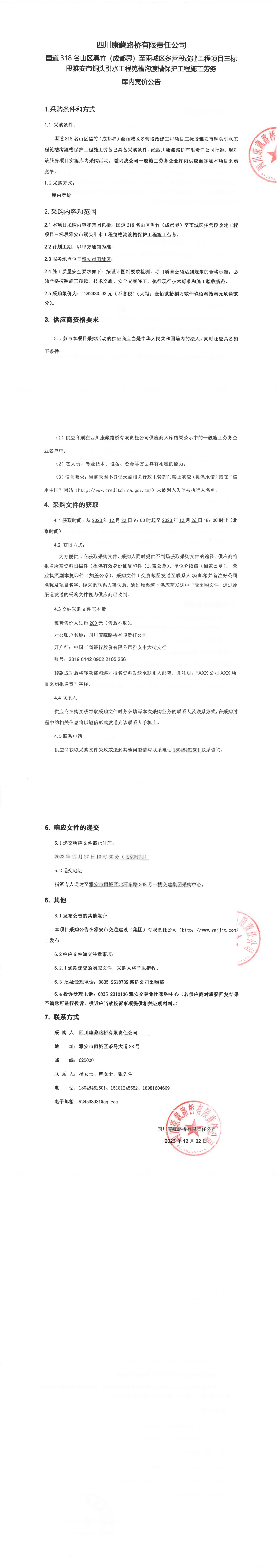 四川康藏路橋有限責(zé)任公司國(guó)道318名山區(qū)黑竹(成都界)至雨城區(qū)多營(yíng)段改建工程項(xiàng)目三標(biāo)段雅安市銅頭引水工程筧槽溝渡槽保護(hù)工程施工勞務(wù)庫(kù)內(nèi)競(jìng)價(jià)公告