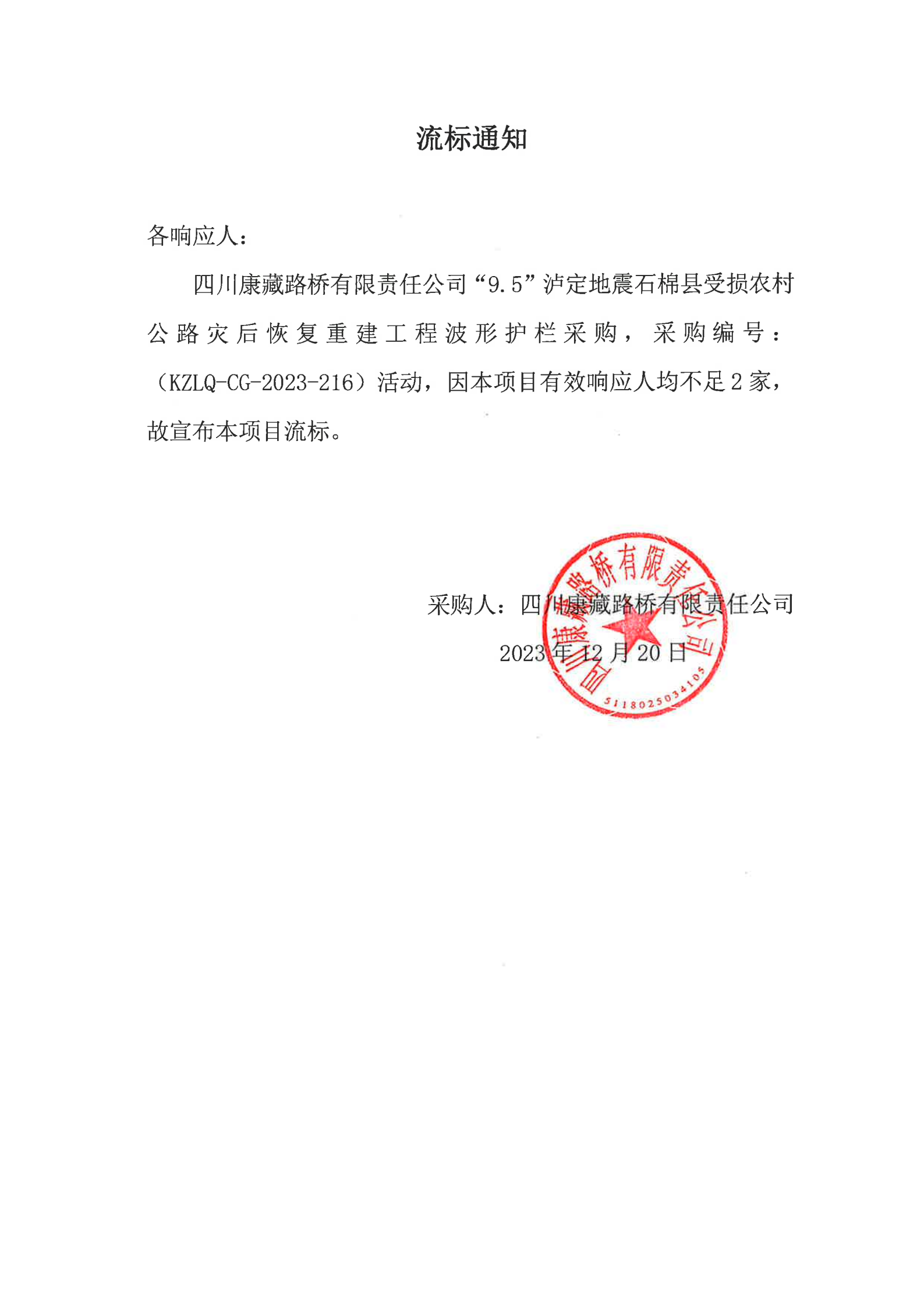 四川康藏路橋有限責任公司“9.5”瀘定地震石棉縣受損農(nóng)村公路災(zāi)后恢復重建工程波形護欄采購流標通知