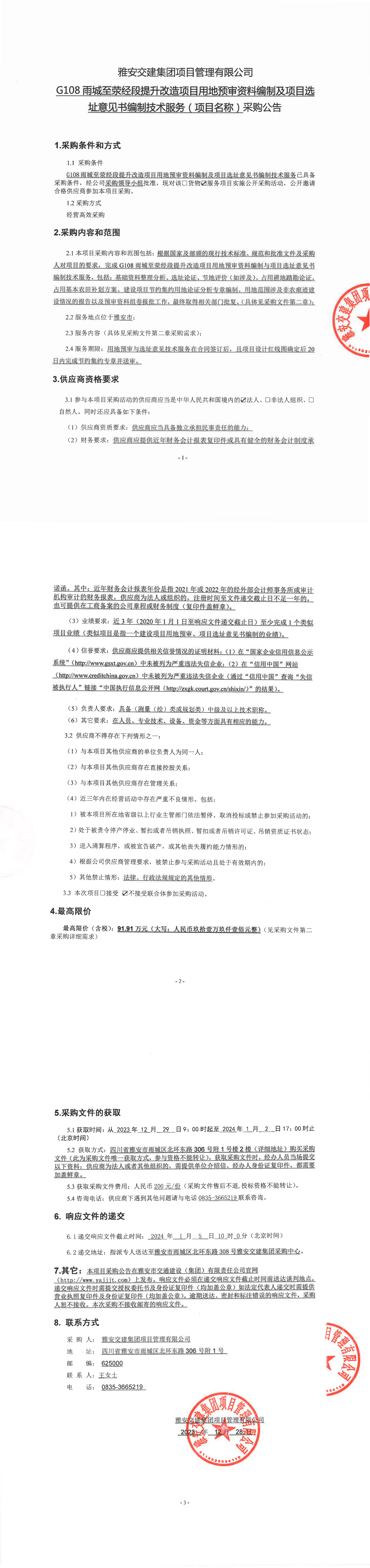 雅安交建集團項目管理有限公司G108雨城至滎經(jīng)段提升改造項目用地預審資料編制及項目選址意見書編制技術服務(項目名稱)采購公告