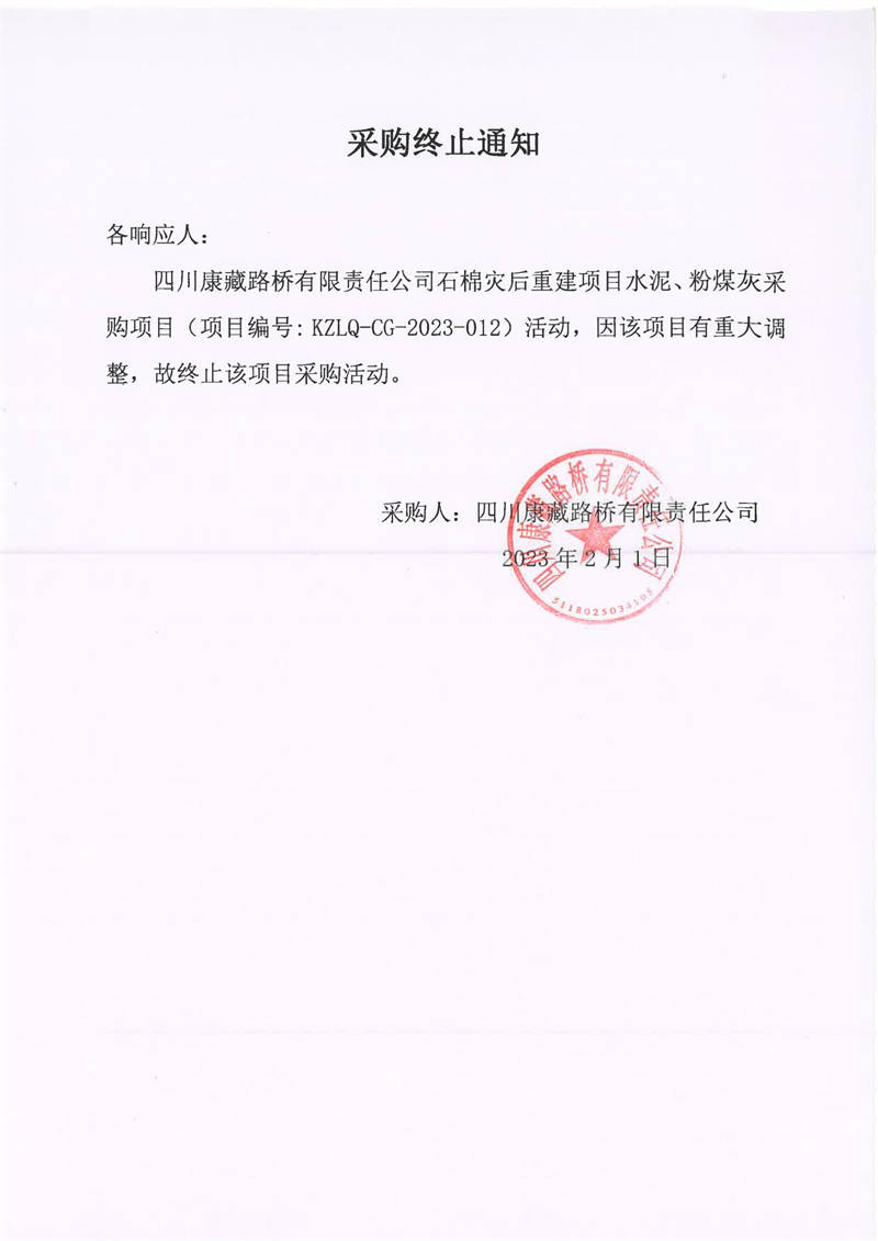 四川康藏路橋有限責(zé)任公司石棉災(zāi)后重建項目水泥、粉煤灰采購項目采購終止通知