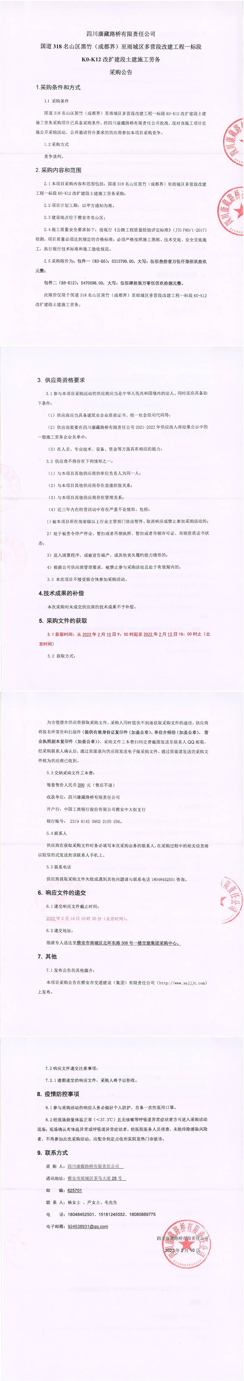 四川康藏路橋有限責(zé)任公司國(guó)道318名山區(qū)黑竹(成都界)至雨城區(qū)多營(yíng)段改建工程一標(biāo)段K0-K12改擴(kuò)建段土建施工勞務(wù)采購(gòu)公告