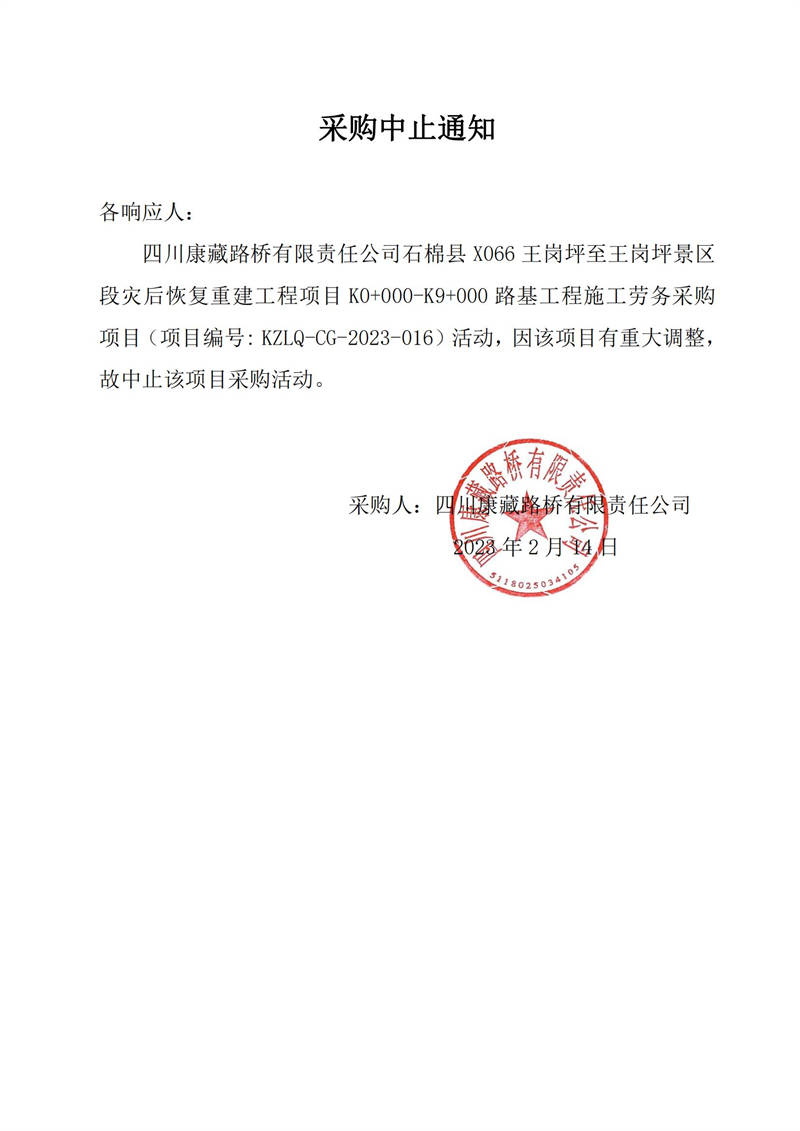 四川康藏路橋有限責(zé)任公司石棉縣X066王崗坪至王崗坪景區(qū)段災(zāi)后恢復(fù)重建工程項目K0+000-K9+000路基工程施工勞務(wù)采購中止公告