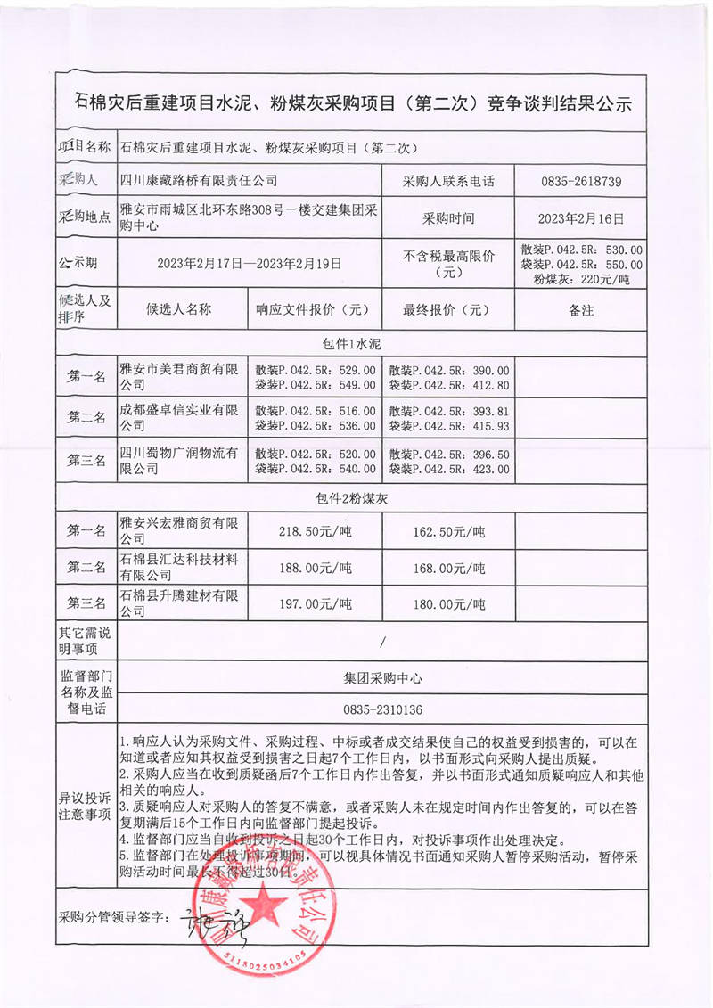 四川康藏路橋有限責(zé)任公司石棉災(zāi)后重建項目水泥、粉煤灰采購項目(第二次)競爭談判結(jié)果公示