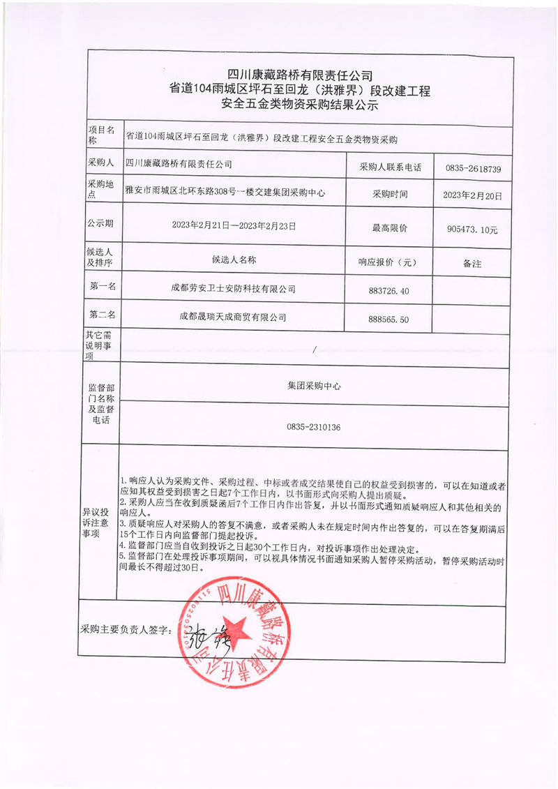 四川康藏路橋有限責(zé)任公司省道104雨城區(qū)坪石至回龍(洪雅界)段改建工程安全五金類物資采購結(jié)果公示