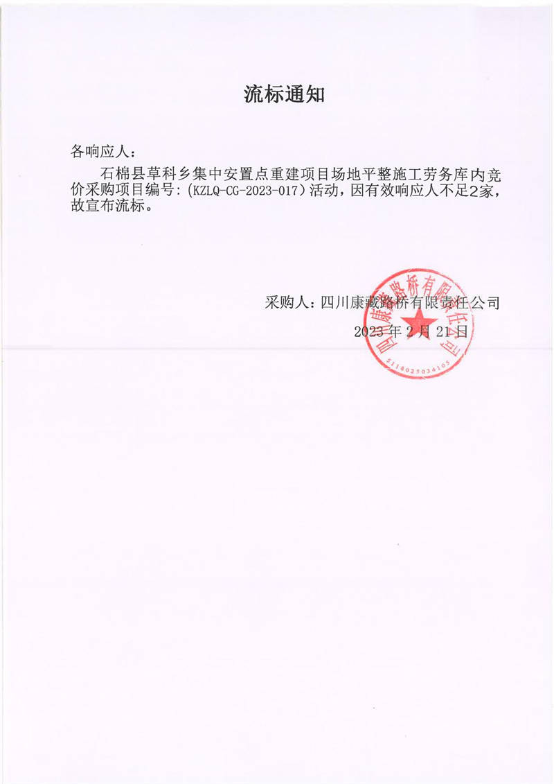 四川康藏路橋有限責(zé)任公司石棉草科鄉(xiāng)集中安置點(diǎn)重建項(xiàng)目場(chǎng)地平整施工勞務(wù)庫內(nèi)施工勞務(wù)庫內(nèi)采購(gòu)流標(biāo)通知