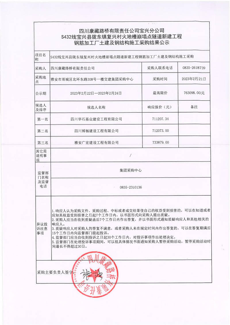 四川康藏路橋有限責(zé)任公司寶興分公司S432寶興縣隴東鎮(zhèn)復(fù)興村火地槽崩塌點隧道新建工程鋼筋加工廠土建及鋼結(jié)構(gòu)施工采購結(jié)果公示