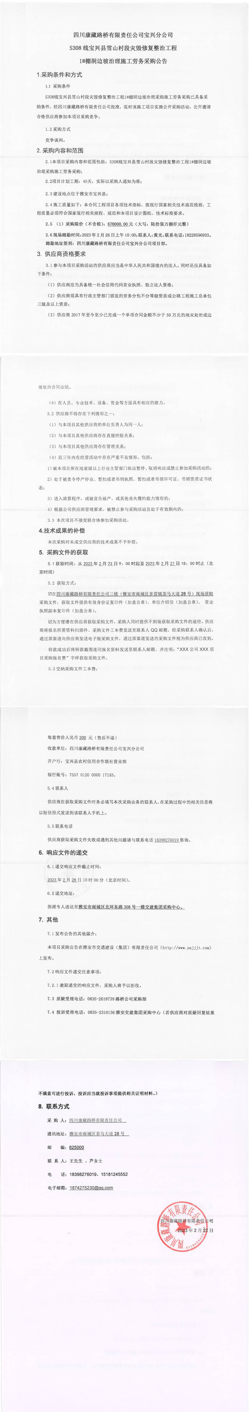 四川康藏路橋有限責(zé)任公司寶興分公司S308線寶興縣雪山村段災(zāi)毀修復(fù)整治工程1#棚洞邊坡治理施工勞務(wù)采購(gòu)公告