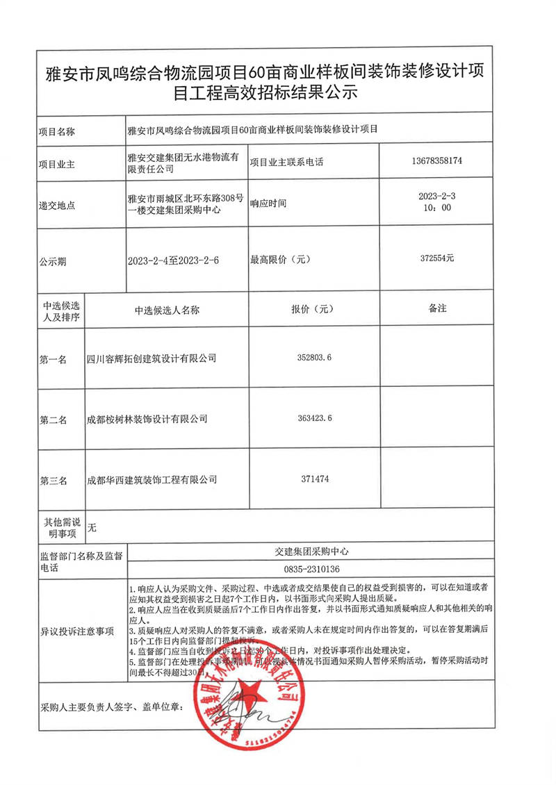 雅安交建集團(tuán)無(wú)水港物流有限責(zé)任公司雅安市鳳鳴綜合物流園項(xiàng)目60畝商業(yè)樣板間裝飾裝修設(shè)計(jì)項(xiàng)目工程高效采購(gòu)結(jié)果公示